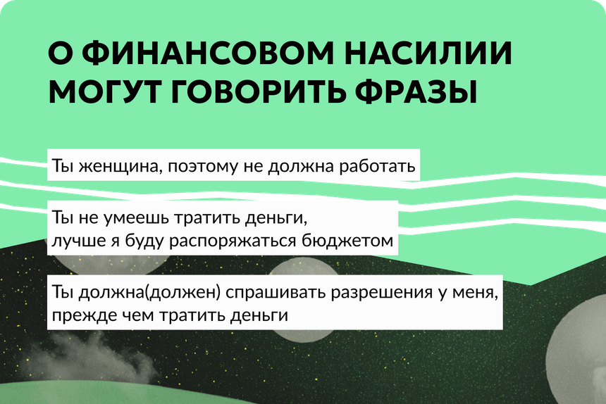 Финансовое или экономическое насилие — это контроль над деньгами и другими материальными ресурсами человека, который лишает его возможности самостоятельно распоряжаться финансами и делает зависимым от того, кто контролирует.