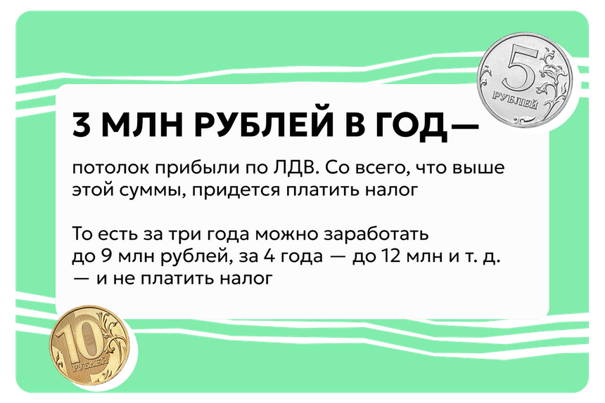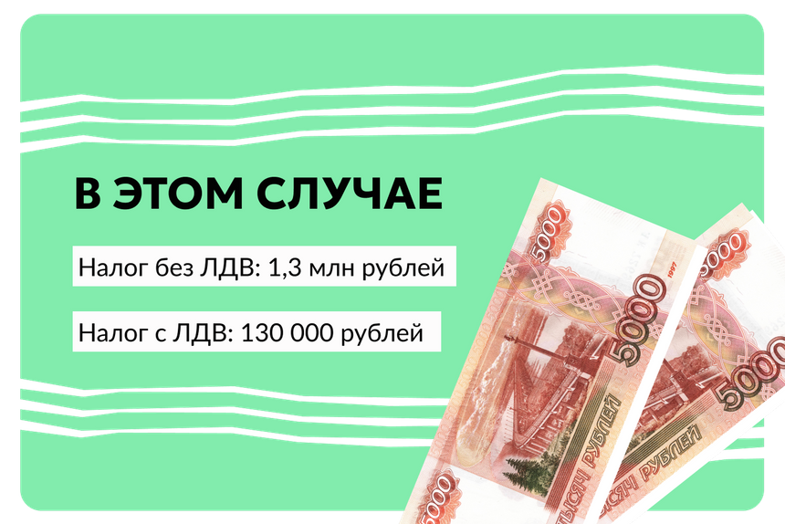 Откуда взялась разница в 1,17 млн рублей? Была прибыль 10 млн рублей. По ЛДВ можно не платить налоги с 9 млн за три года. То есть из общей прибыли мы вычитаем «льготные» 9 млн — получается 1 млн рублей. То есть из 10 наших гипотетических миллионов налог 13% нужно заплатить только с одного — получится 130 000 рублей.
