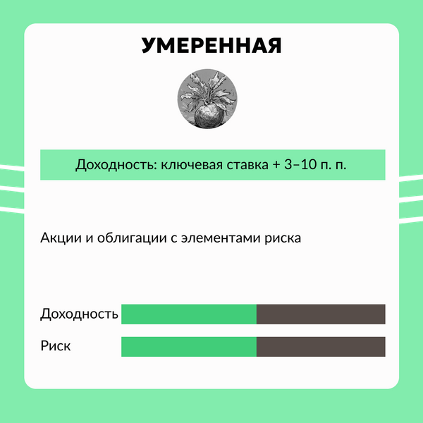 Умеренная. В эту категорию входят консервативные стратегии «с перчинкой». Могут быть покупки акций «недооцененных» компаний, но дозированно, как специи в супе. Когда рынок трясет, управляющий инвестор подстраховывается золотом — оно не обесценивается в кризис.