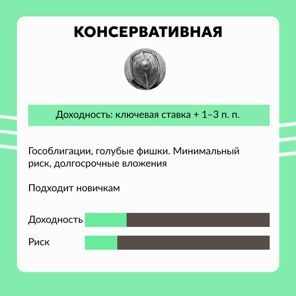 Консервативная. Подойдет новичкам, которые пока не готовы рисковать. Система будет копировать для вас инвестиции на долгий срок и только в надежные инструменты: гособлигации, акции крупных компаний, биржевые фонды. Управляющий инвестор спокойно и глубоко изучает рынок, не пытаясь быстро заработать. В итоге доходность небольшая, но в случае чего потери будут незначительные.