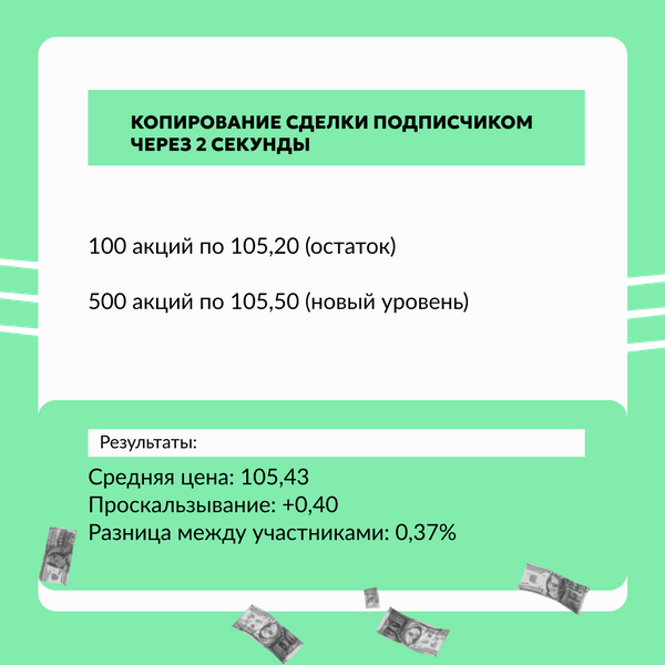 Из-за проскальзываний подписчик, как правило, зарабатывает меньше управляющего инвестора. И чем агрессивнее стратегия, тем сильнее проскальзывания. Они могут составлять десятки и сотни рублей.