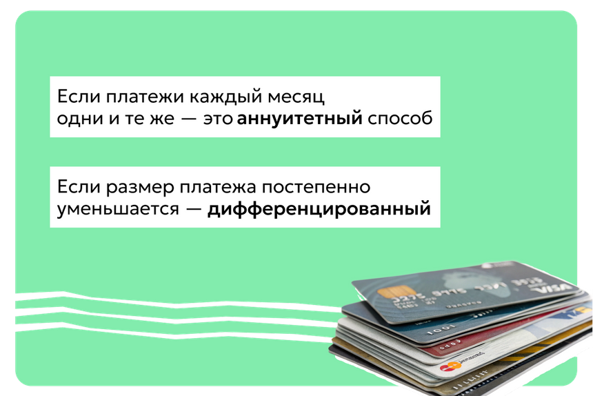 В соглашении с банком вам пропишут способ начисления процентов. Всего их два — аннуитетный и дифференцированный.