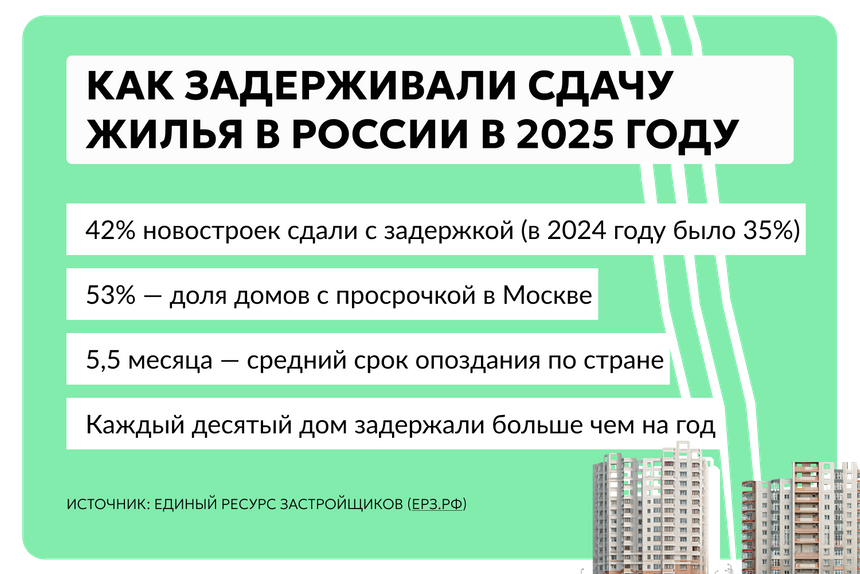 В 2025 году застройщики сдали вовремя только 58% жилых домов. В Москве — вообще меньше половины. В среднем людям приходится ждать ключей на полгода дольше, чем они планировали. Часто это значит платить ипотеку и аренду квартиры.