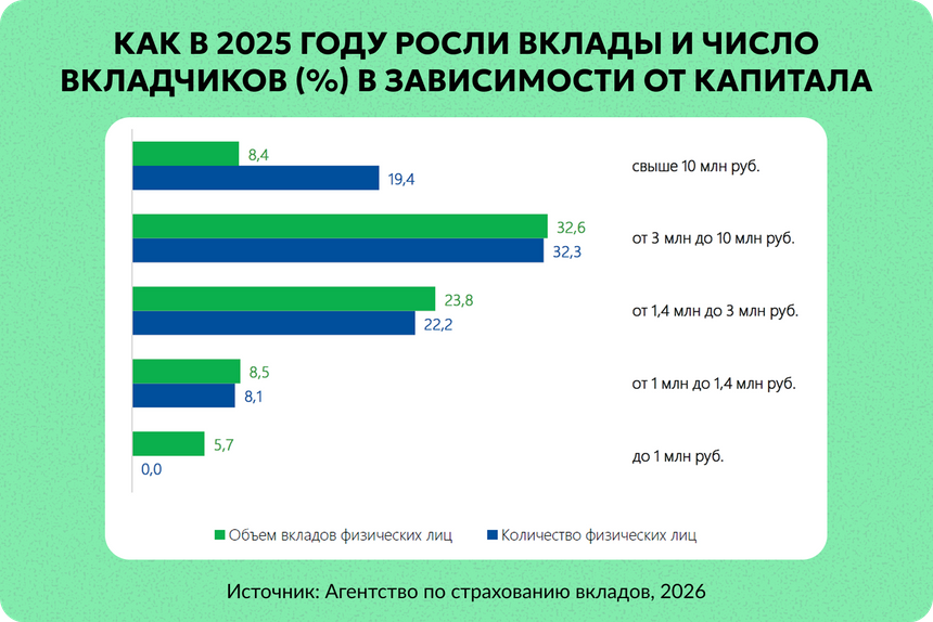 Основную часть из прироста почти в 10 трлн рублей в 2026 году получили люди с капиталом свыше 1 млн рублей. А таких — менее 5%.