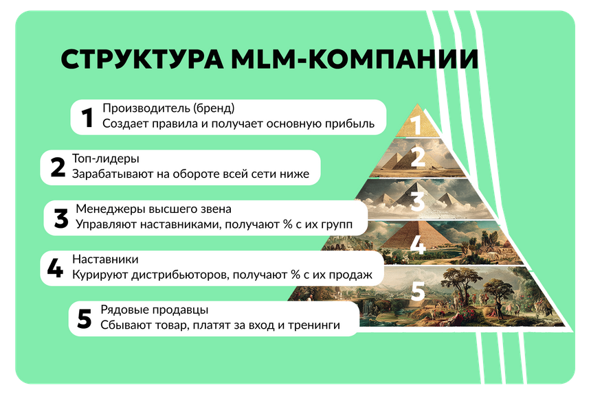 Со временем, когда достигнете определенного уровня продаж, вам разрешат привлекать людей в свою «команду» и стать не просто продавцом, а наставником. Все потому, что структура MLM-компании — это многоуровневая пирамида.