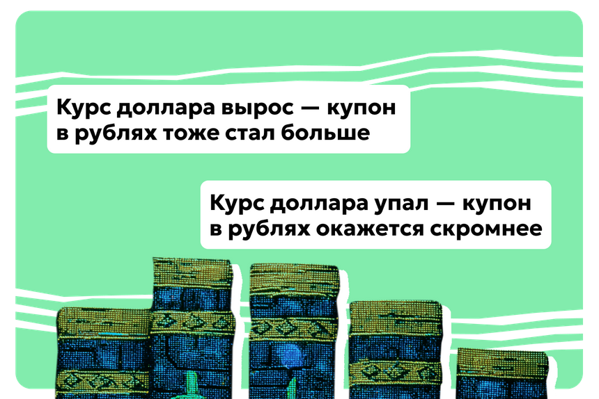 Главная особенность здесь в том, что размер купона привязан к иностранной валюте. Например, если у облигации номинал $1000, а купон 5% годовых, то ваш доход составит $50 в год. Но на счет вы получите не доллары, а рубли. Сумму пересчитают по официальному курсу Центробанка на дату выплаты.