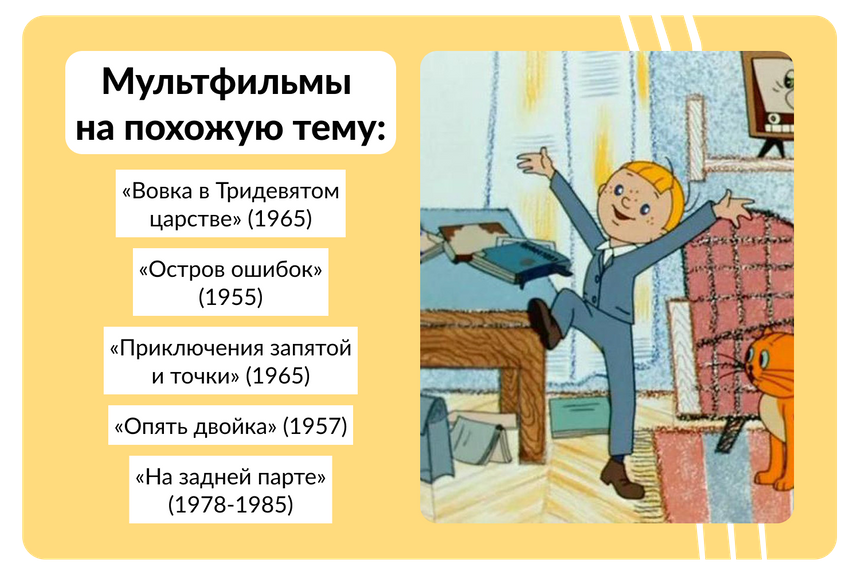 О чем мультфильм. Горе-ученик вместе со своим котом попадает туда, где живут его ошибки: полтора землекопа, хлебное дерево, плотоядная корова и белый медведь, живущий на юге. Ему предстоит все исправить.