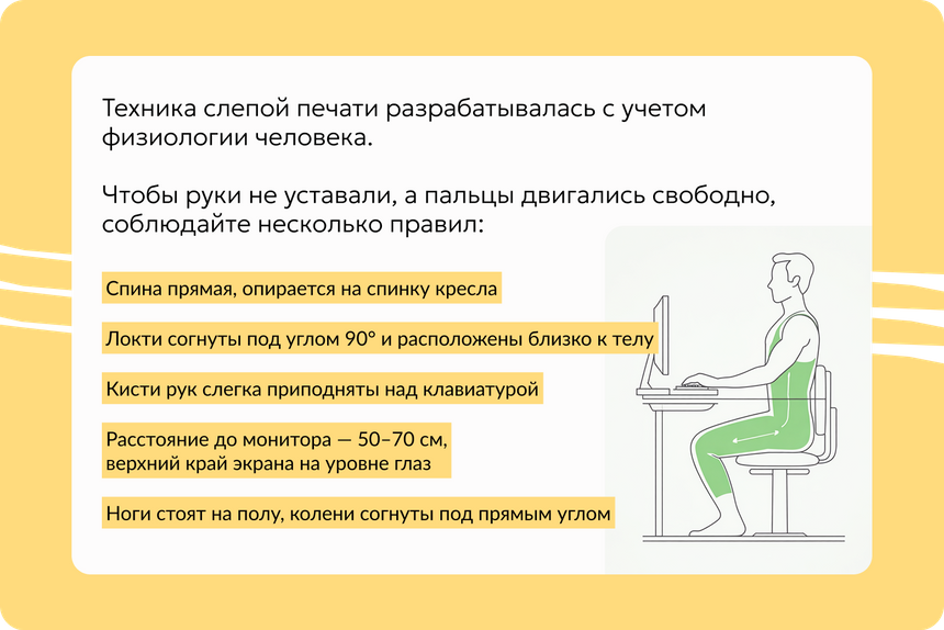 Техника слепой печати разрабатывалась с учетом физиологии человека. Чтобы руки не уставали, а пальцы двигались свободно, соблюдайте несколько правил: