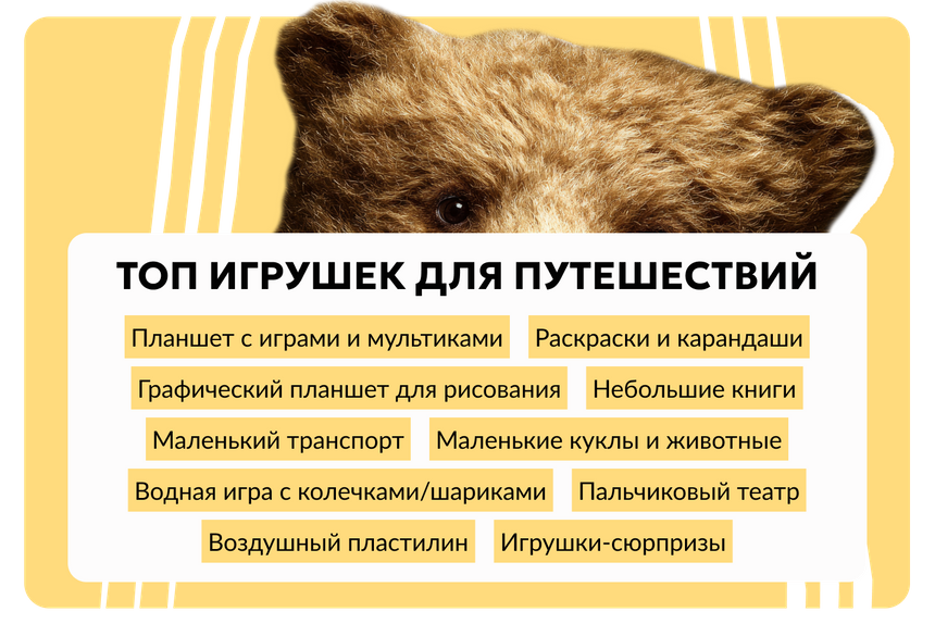 Малышам хорошо заходят игрушки в виде того транспорта, на котором вы путешествуете. Если это самолет — купите небольшой самолетик, если поезд — возьмите вагончик. Ребенку, скорее всего, захочется поиграть в путешественника с такой игрушкой.