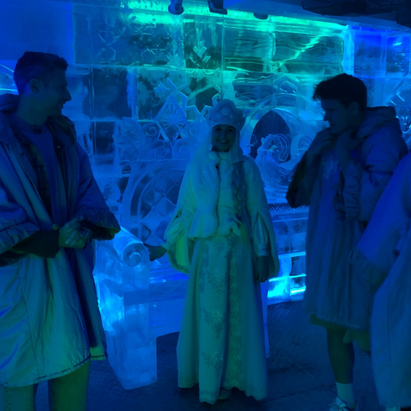Ледяная комната со скульптурами из озерного льда. Здесь можно выпить угощение из ледяных стаканчиков.