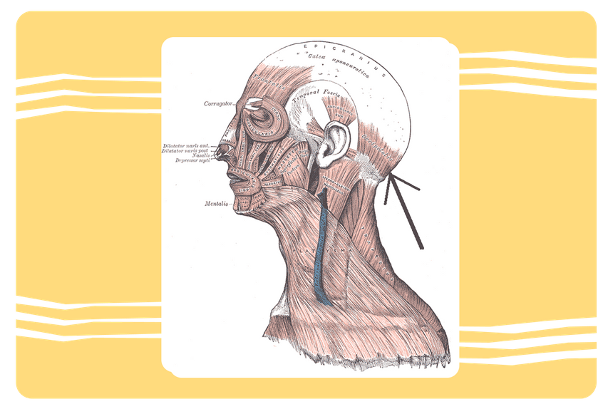Прямоугольная мышца на затылке. Вместе с лобной мышцей она помогает нам поднимать брови и шевелить кожей головы.