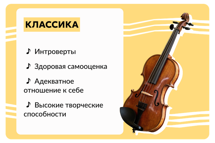 Классическая музыка. Ее любители слегка интроверты, но со здоровой самооценкой и адекватным отношением к себе. К тому же у них, как правило, высокие творческие способности.