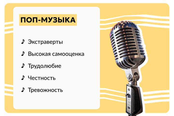 Поп-музыка. Музыку в стиле «поп» слушают экстраверты с высокой самооценкой. Им свойственно трудолюбие и честность. Правда, они более тревожные, и творчество их не особо интересует.