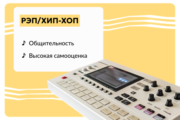 Рэп/хип-хоп. Поклонники рэпа общительнее, чем любители других музыкальных жанров, и чаще обладают высокой самооценкой. При этом они не так агрессивны, как о них принято думать.