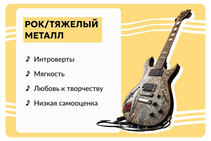 Рок/тяжелый металл. Любители рока тоже неагрессивны. Даже наоборот, среди них много интровертов, мягких и творческих людей. А еще они зачастую страдают от низкой самооценки.