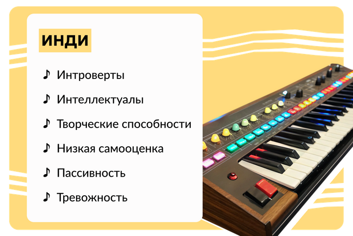 Инди. Среди любителей некоммерческой музыки часто можно встретить интровертов, интеллектуалов и творческих личностей. Им свойственны низкая самооценка, тревожность и пассивность. Также они зачастую не отличаются трудолюбием.