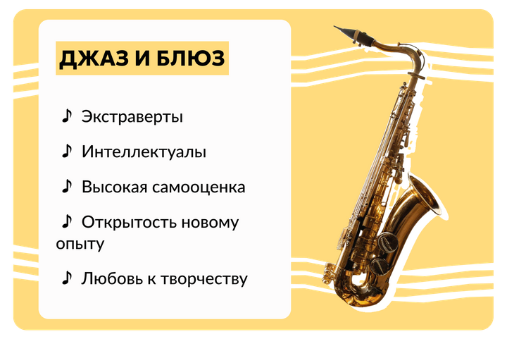 Джаз и блюз. Поклонники джаза и блюза больше экстраверты, интеллектуалы и обладают, как правило, высокой самооценкой. Им нравится творчество, а еще они любят пробовать все новое.