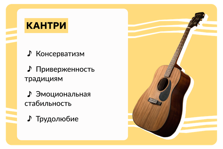 Кантри. Любители кантри часто консервативны, привержены традициям и неохотно идут в новый опыт. При этом они эмоционально стабильны и трудолюбивы.