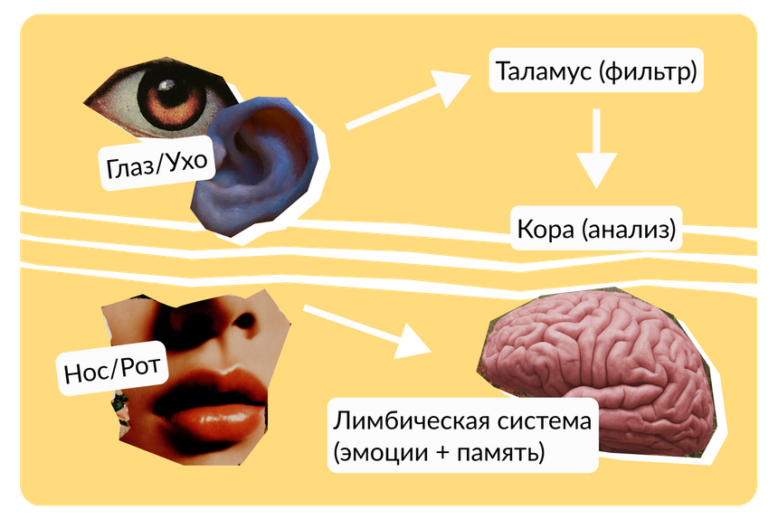 Но информация о вкусе и особенно о запахе идет другим путем. Она поступает напрямую в лимбическую систему — совокупность отделов мозга, отвечающих за эмоции и формирование памяти. Ключевые из них — миндалина (центр эмоций) и гиппокамп (центр памяти).