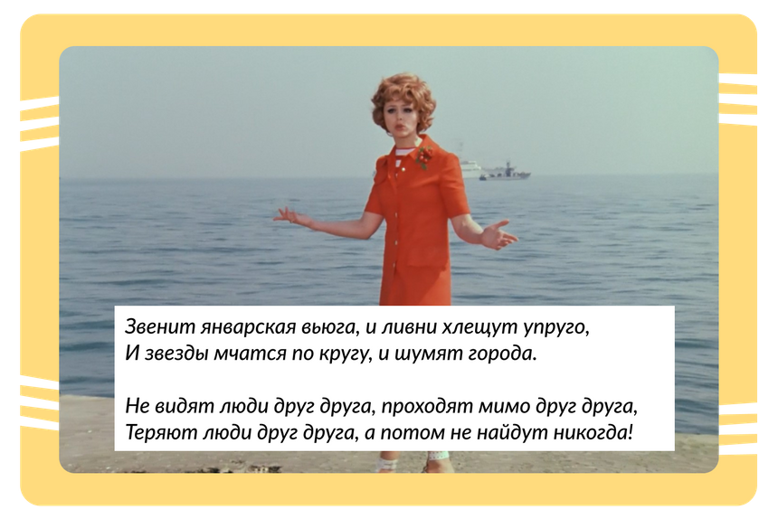 Интересно, что в фильме героиня поет про январскую вьюгу, хотя сцена снята летом на пляже.