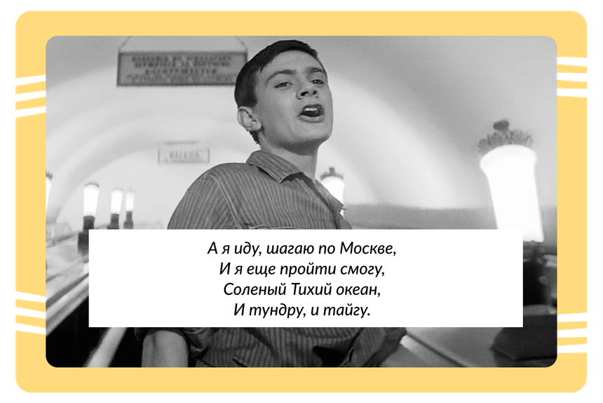 Песня «А я иду, шагаю по Москве» стала настоящим символом столицы и гимном шестидесятников. Ее создали Андрей Петров (музыка) и Геннадий Шпаликов (слова и сценарий одноименного фильма). А на экране ее поет не кто иной, как молодой Никита Михалков, для которого это была одна из его первых ролей.