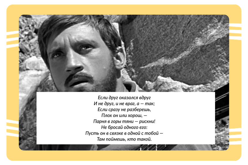 Баллада об альпинистах, ставшая визитной карточкой Владимира Высоцкого, была написана для фильма «Вертикаль» Станислава Говорухина. А первая фраза «Если друг оказался вдруг…» стала поистине крылатой.