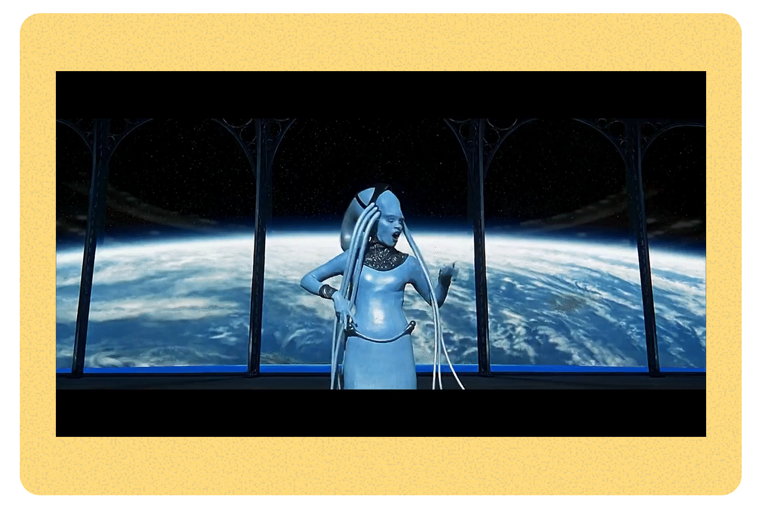 Это звание можно отдать финальным кадрам фильма. На них инопланетная певица Дива (та самая дама синего цвета со шнурами на голове) выступает на космическом корабле с оперой.