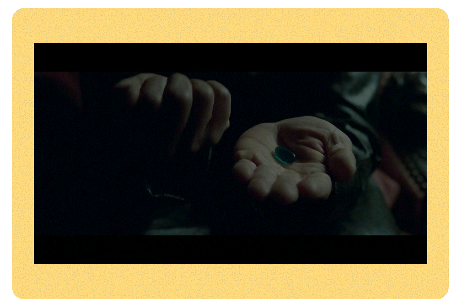 Центральный момент — борющийся против машин Морфеус предлагает Нео выбрать таблетку: синяя — «проснешься в своей постели и поверишь, что это был сон», — говорит он; красная — «войдешь в страну чудес» и узнаешь правду о матрице.