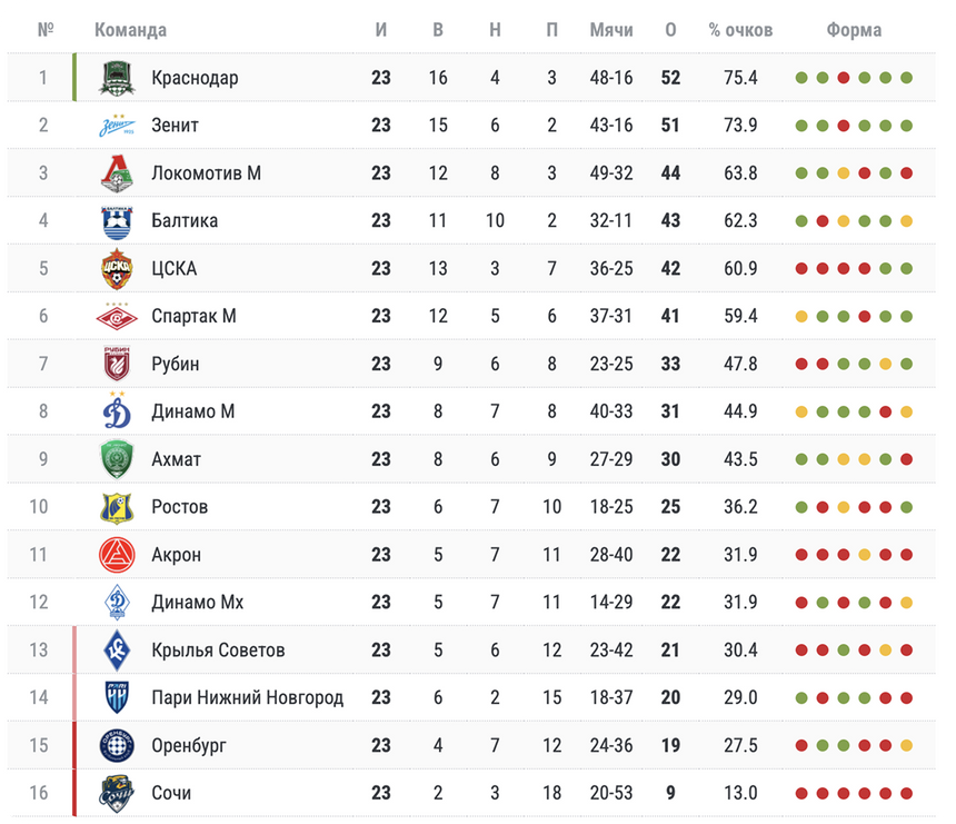 Турнирная таблица: «Зенит» и «Краснодар» продолжают битву за чемпионство