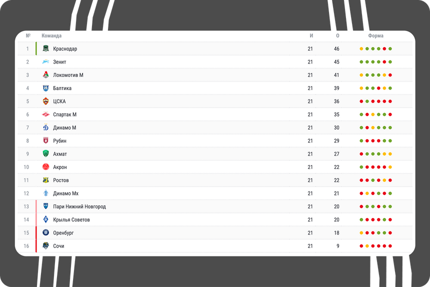 По итогам 21-го тура «Краснодар» по-прежнему лидирует в РПЛ. Всего на одно очко от него отстает «Зенит». А вот «Локомотив» сдал свои позиции. Развязка чемпионата все ближе!